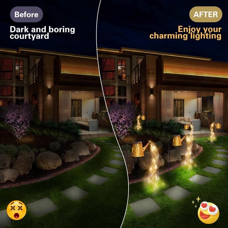 【Solar-powered & Energy saving】The watering can solar garden light feature the latest upgraded solar panel, greatly increase the energy conversion rate. built-in light sensors, that automatically turn on in the dark and turn off automatically during the day (Keep the switch in the "on" position).can be used 8-12 hours of use after full charging. The yard decor lights can be placed completely in your outdoor area without the need to connect to a power source, easy to use.